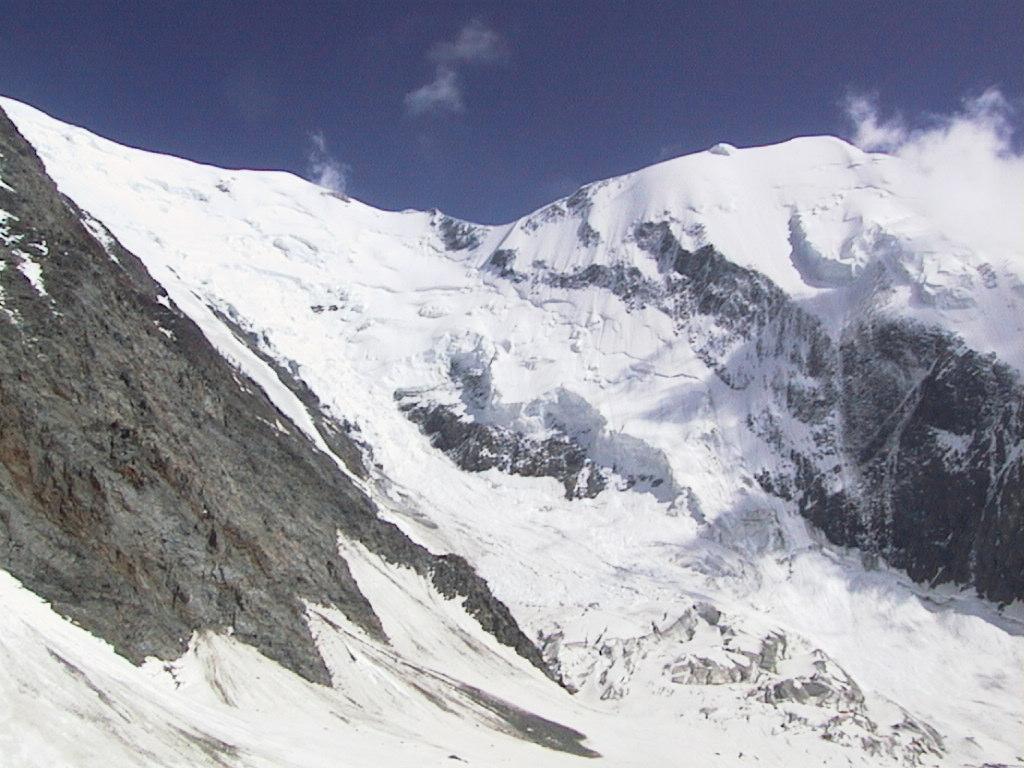 From here up the snow took over the rocks. This is a closer look of Piton des Italiens, 4002 meters. You can also see the starting point of the glacier going down till about 2000 meters. Mont Blanc wasn't far away, but we couldn't see it because of the other mountains. |
