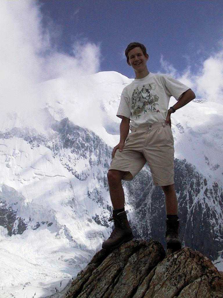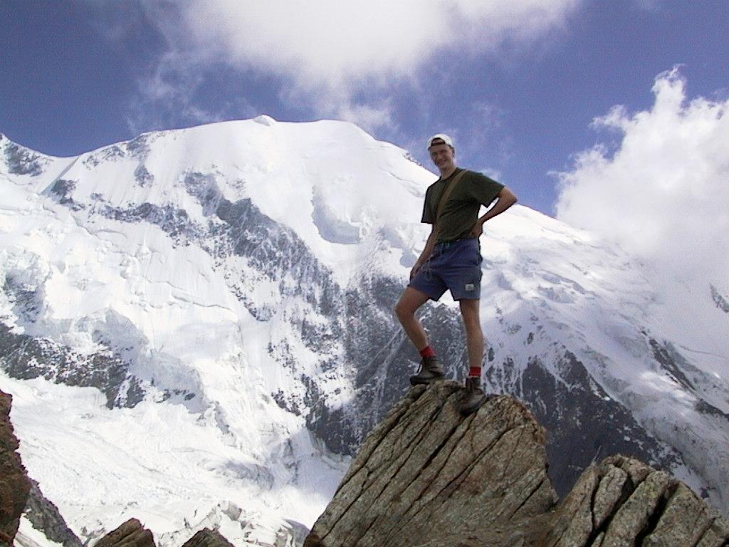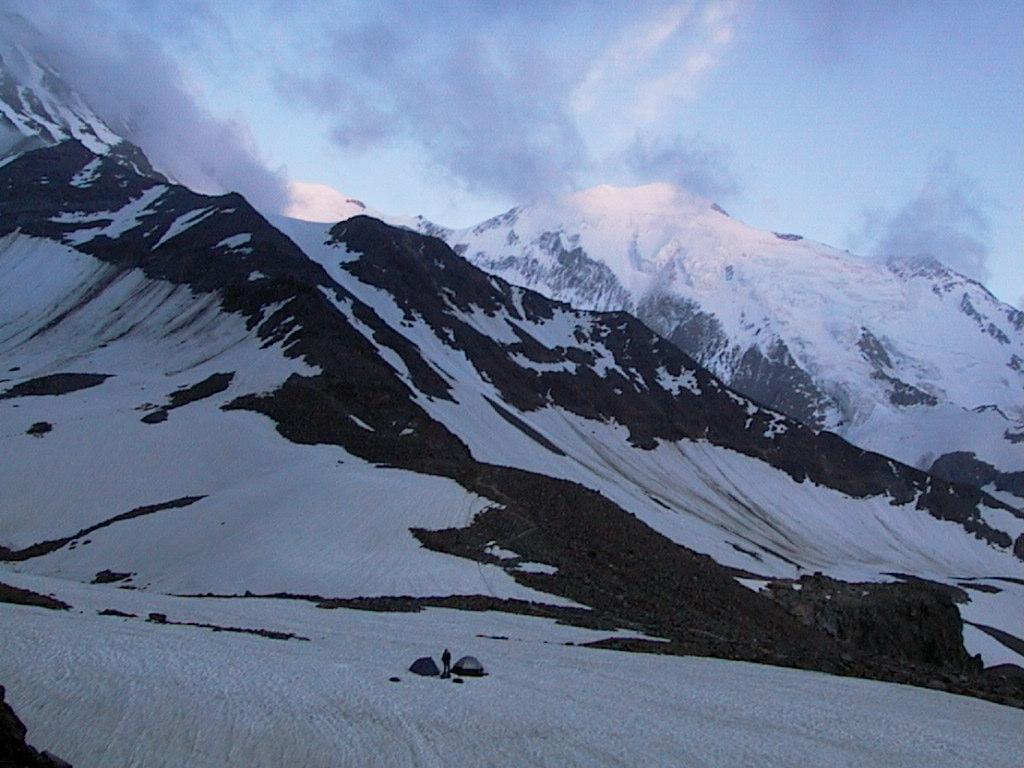 Over 2000 meters of altitude climbed in one day - time for a picture. This is Martin, I also have an almost similar picture of Bruno and me. After taking the pictures we headed down to 2700 meters again to set up the tents. During the trip we heard many small stonefalls and a few tiny avalanches too, and decided not to try to climb any higher the following day. A rescue helicopter was also around several times during the evening. |