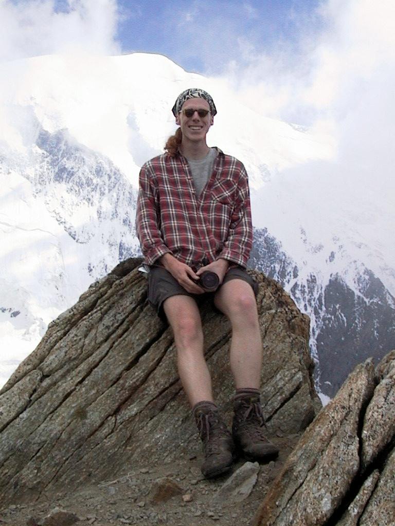 After lunch Bernardo, Dominik, Fabian and Jan decided to leave, because they had to get down before dark. Bruno, Carlos, Martin and I had prepared to stay overnight, and continued climbing towards the real mountains. Tête Rousse, our aim for the day, is the first little top in the middle of the picture, with Aiguille de Goûter rising behind it on the left. On the right you can see Piton des Italiens, 4002 meters. |