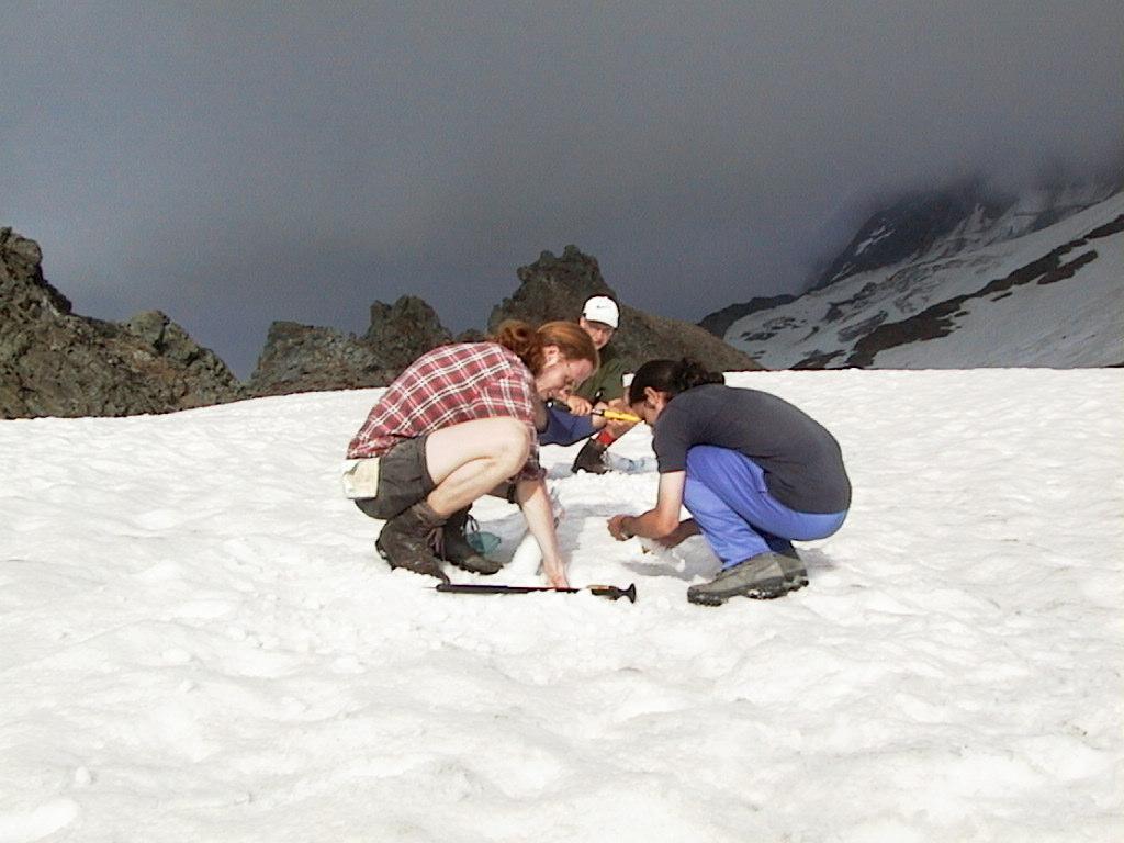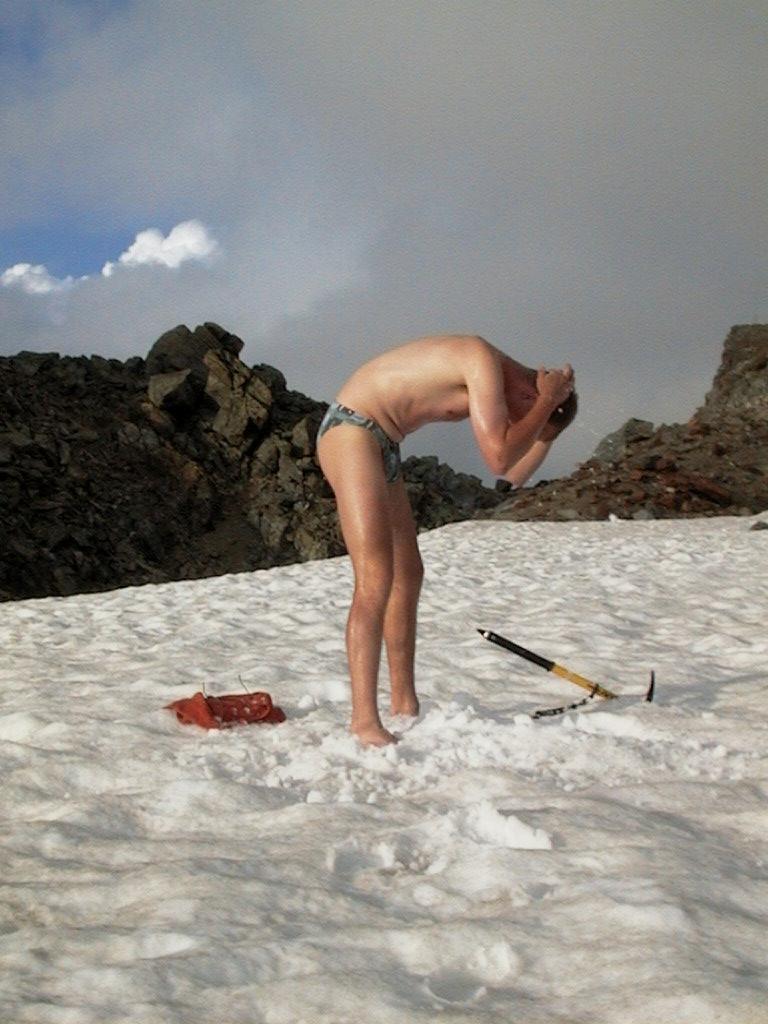 Bruno didn't like the idea of his sleeping bag getting dirty, so he washed the sweat off with snow. Certainly refreshing! |