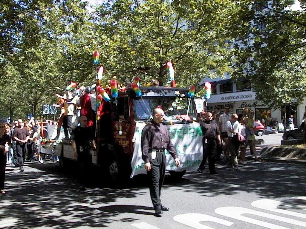 After sleeping late Friday morning, we went to see the city and do some shopping. Some green people were having their own little parade, protesting against the huge mess Love Parade leaves behind. |