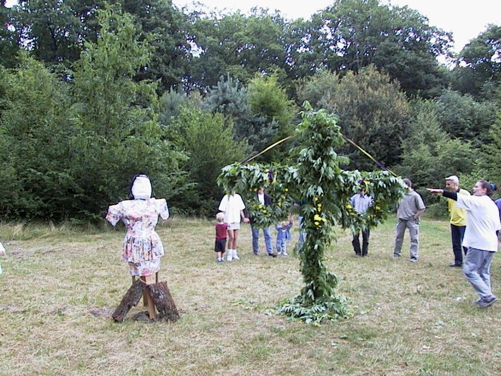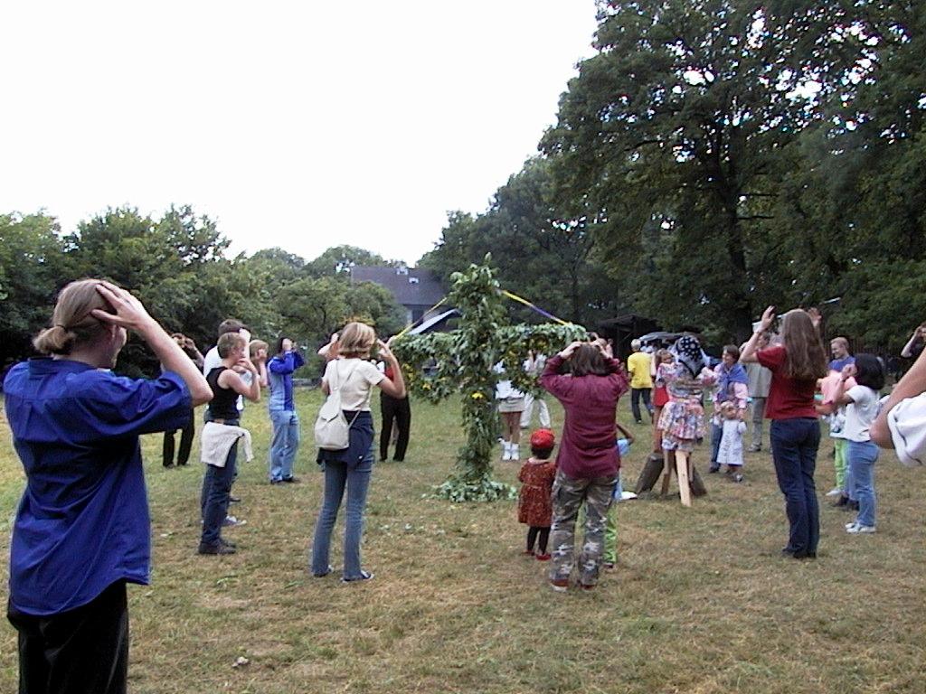 The party began by dressing up the midsummerpole, a Swedish tradition. When I arrived, this was already done and people began gathering around the pole to play games, led by two beautiful Swedes. You can also see a witch on the left that belongs to Danish midsummer. |