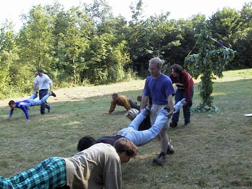 Here a pen was tied by a string around your waist, hanging loose in the back. You had to get it in a bottle without touching with hands, of course. The game was organized as a competition between five teams. Erkki and Sami were among the first to try it, with one of our friendly instructors watching behind. |
