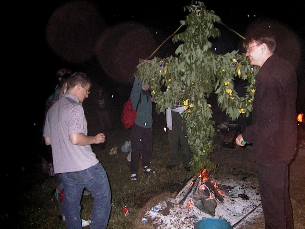 As a bonfire is an important part of Finnish midsummer traditions, we decided we should try to build one. According to the Swedes, the pole isn't built exactly for that purpose, but the Finns overnumbered the Swedes in the party by a fair margin anyway. :-) |
