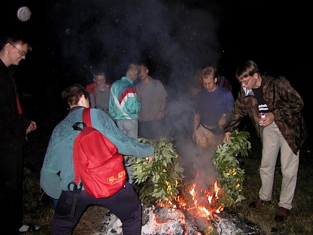The fresh leaves didn't burn very well, but we got enough flames and smoke for Erkki to show how to jump over the fire. |