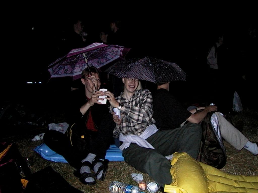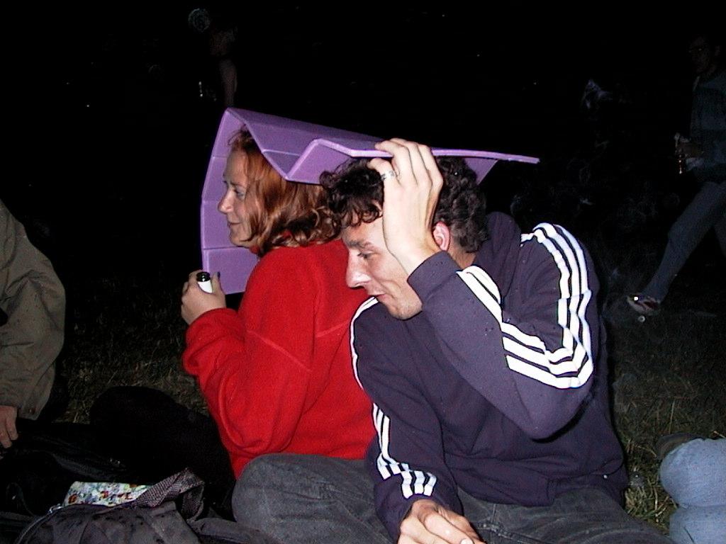 Later in the evening, it started raining. Freya and Peter improvising without an umbrella. |