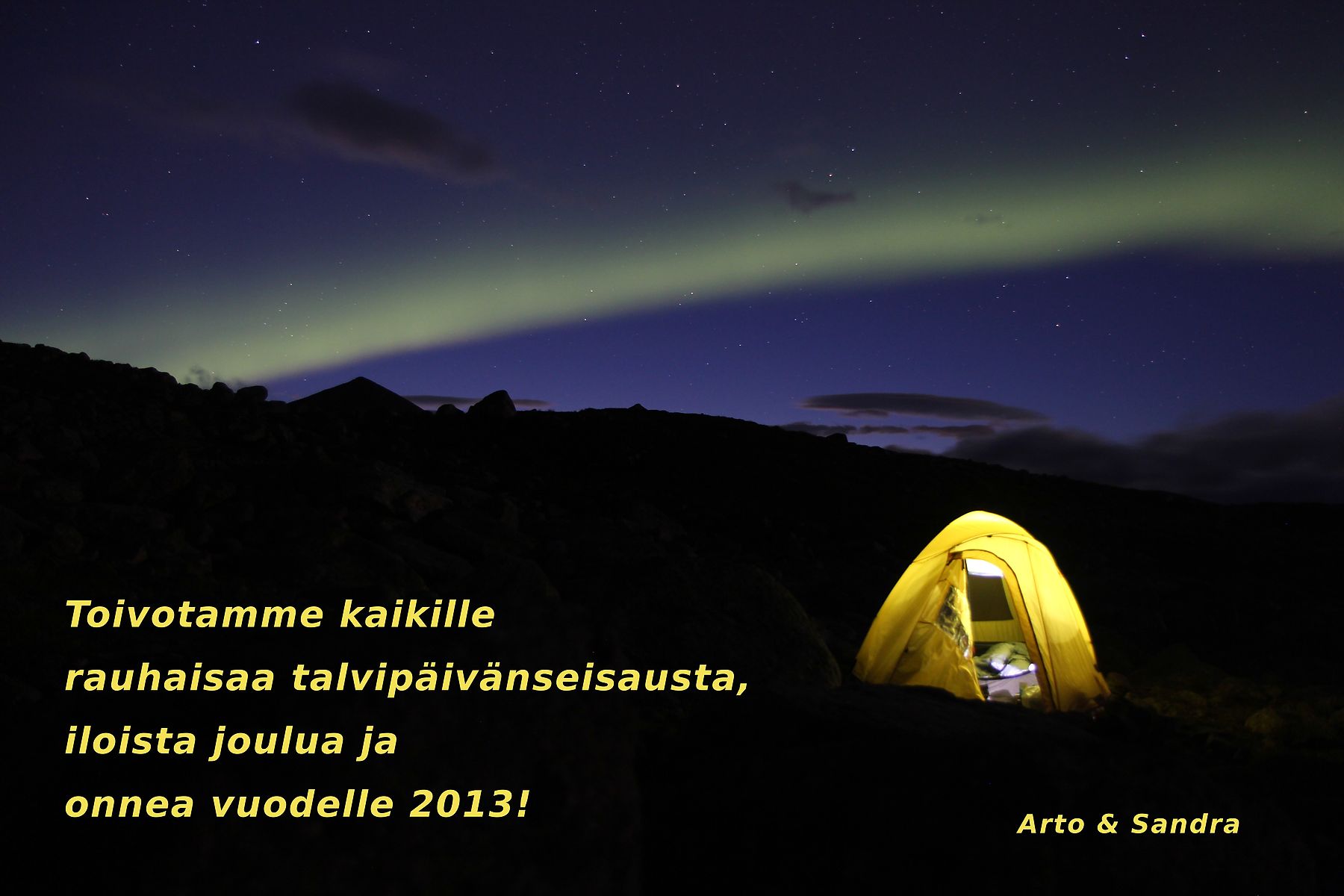 Kuva: Telttapaikka revontulten alla. Sarekin kansallispuisto, Ruotsi, syyskuu 2012.