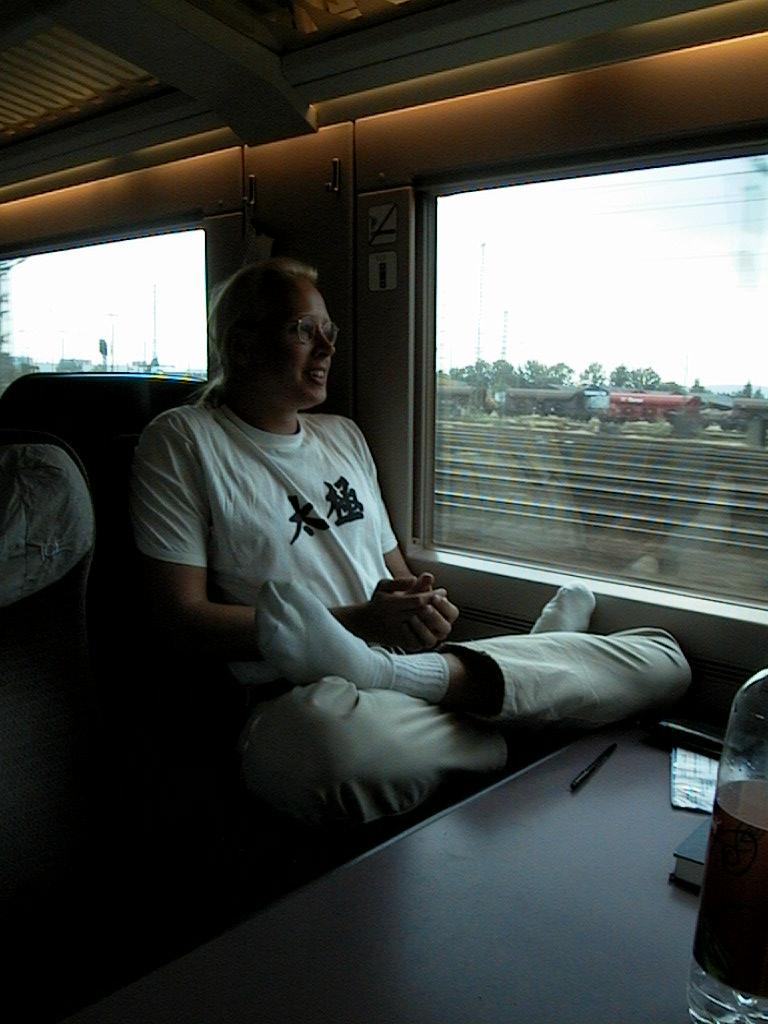 We left Geneva Thursday morning at about 9 o'clock. Here's Jani showing how to sit unconfortably in the train. |