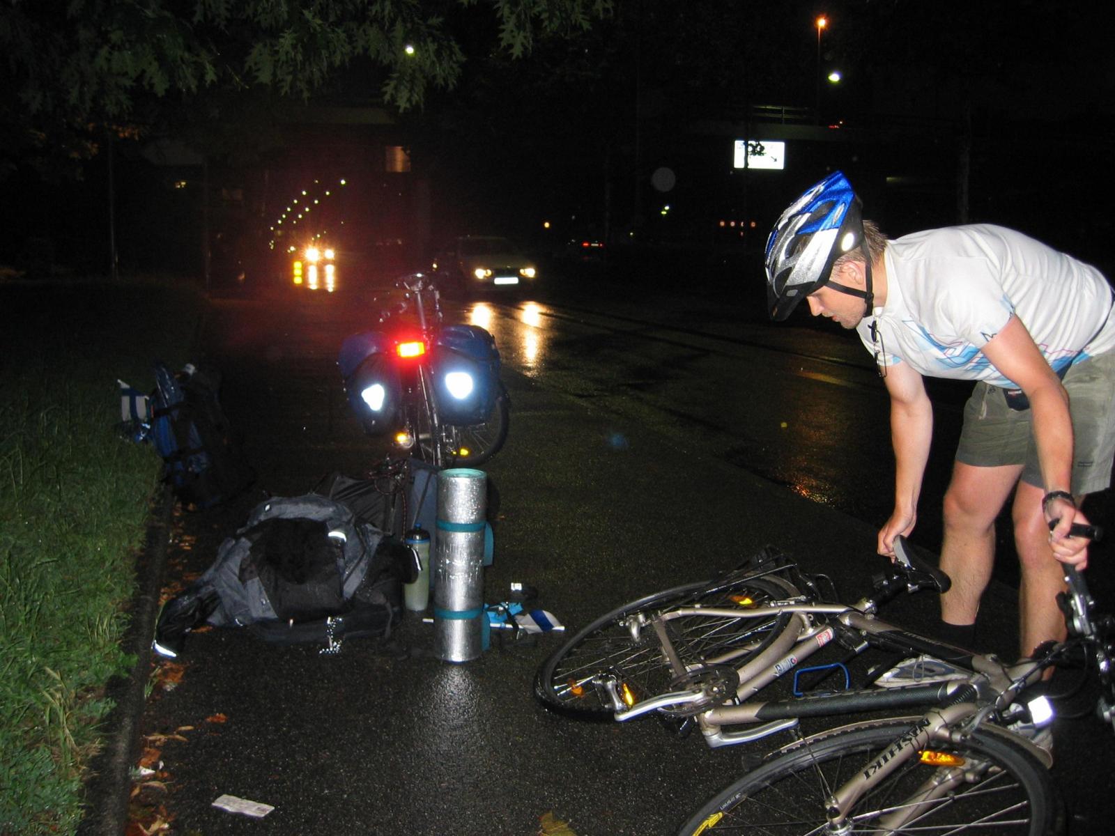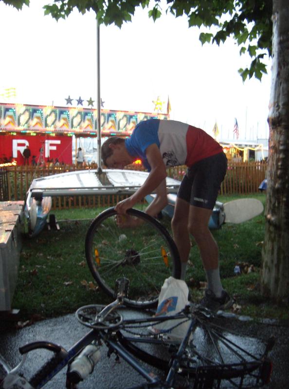 ![]() Fixing a flat in the rain next to the Fêtes de Genève festival area. 594x800 (65 kB) 1189x1600 (187 kB) |