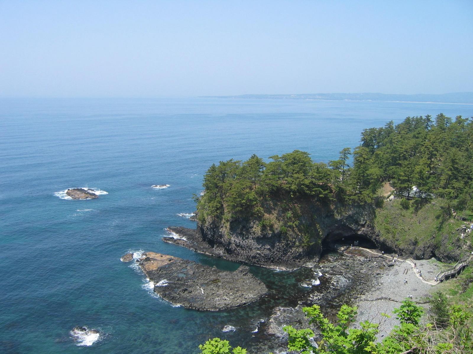 Especially the west coast of Noto has many impressive rock formations and nice villages by the sea. Our first target was Gammon (巌門), which gathers perhaps the biggest load of tourists with it's impressive cliffs, including a stone tunnel formed by waves rushing through it. From Gammon we took the coastal route and found the two next superb places by accident using the method "Hey, see that bunch of cars stopped by the road - there must be something interesting". The first of them was a beautiful shrine built between two small isles and the second Yoshitsune no Funakakushi (義経の舟隠し).
