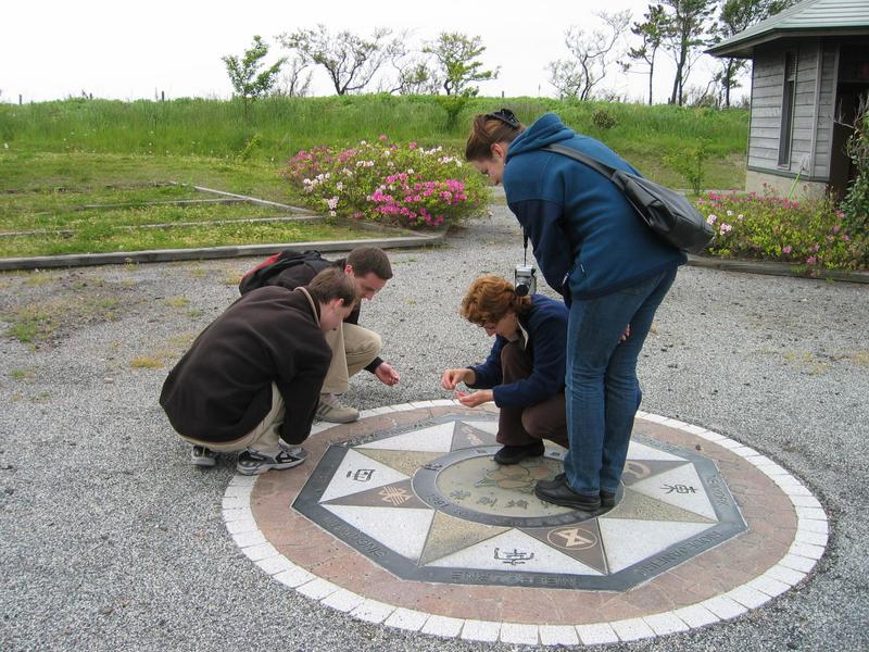 The next day we started early to see the morning market in Wajima (輪島) around 8 o'clock. The famous market turned out to be of only medium interest, it might have been more enticing if we would have had means and knowledge how to prepare some of the special seafood and other local goodies sold there. The best sights of the day were a couple of huge old thatched-roof houses in Sosogi (曽々木) and a slope full of tiny rice known as Senmaida (千枚田) or Thousand paddies which was by the roadside between Wajima and Sosogi. We also had fun at the lighthouse at the outermost cape of Noto, where we found a stone plate on the ground showing directions to some major locations in the world and used small stones to add a few relevant cities they seemed to have missed. :-)