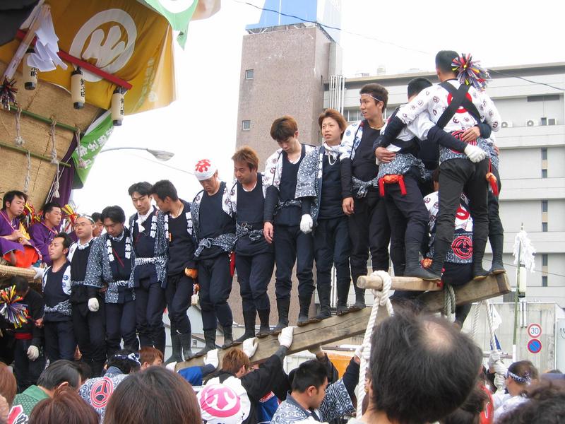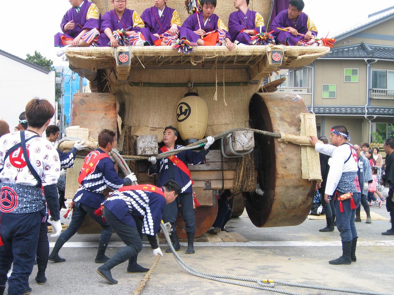 On Monday we drove to Nanao (七尾) to see the Seihakusai (青柏祭) festival. We had prepared for traffic jams but the trip went surprisingly smoothly and we even found a parking place less than a kilometer from the center. As many festivals in Japan, Seihakusai featured a lot of people wearing bright-colored festival clothes, having fun while not hiding of being a bit drunk, different kinds of music and presentations plus numerous small booths selling food and gadgets. The special part of Seihakusai were three huge 20-meter high festival floats which were dragged around the town. The height was apparently dictated by the electric power lines which were less than a meter higher than the tops of the floats.