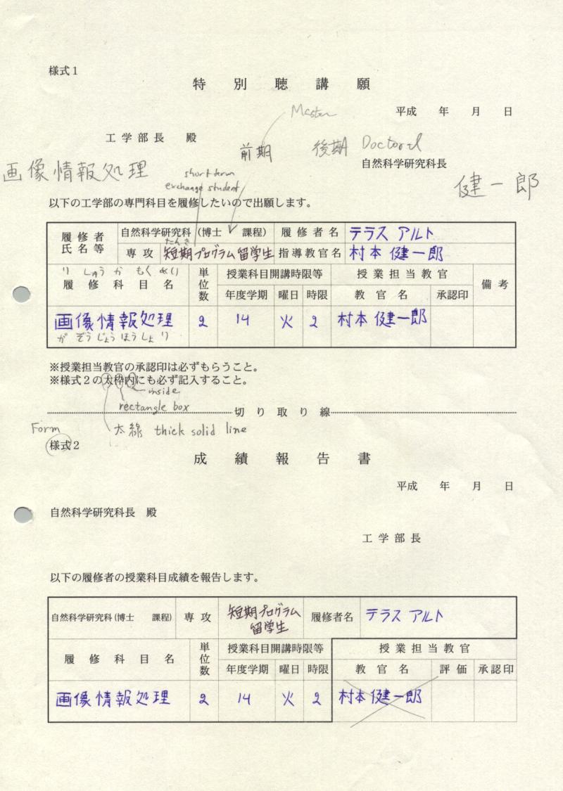 Saapumisen jälkeen täytyi hakea oleskelulupaa (Alien Registration), avata pankkitili ja hoitaa muita byrokratian kuvioita. Suurin osa kaavakkeista oli saatavilla vain japaniksi, mutta niistä selviäminen ei tuottanut isompia ongelmia, kiitos Kanazawan vaihto-opiskelijatoimiston. Osa kaavakkeista oli jopa allekirjoitusta vaille valmiiksi esitäytetty, joten vastoin yleisiä tapojani tuli vedettyä nimi alle useampaankin paperiin kunnolla ymmärtämättä sisältöä. Yliopistolta oli järjestetty bussikuljetus kaupungintalolle ja pankkiin, joten niitäkään ei tarvinnut löytää itse. Kavereilta kuullun mukaan Kanazawa on kuitenkin tässä suhteessa poikkeus, muualla joutuu juoksemaan enemmän itse luukulta luukulle. Joitakin papereita piti Kanazawassakin täyttää toisella kampuksella jossa labra oli, niitä sitten ihmeteltiin japanilaisten opiskelijoiden ja välillä proffankin kanssa yhdessä.