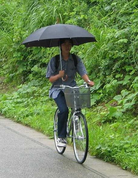 | Japanilaisilla oli hassu ja hiukan vaarallinen tapa pyöräillä sateessa sateenvarjon kanssa. |