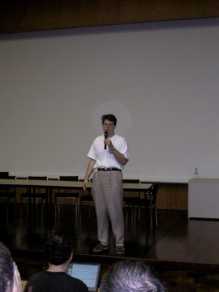 After a short break the leader of every topic described shortly their program and goals for the conference. This was useful especially for people with several interests to get an overview what would be available. Of course many topics didn't have anything planned for the duration of the whole event, so smaller related ones were combined. After lunch in the campus area restaurant I went first to see the Debian people: project leader Wichert Akkerman told about the current state of Debian project and the afternoon was reserved for questions, discussion, getting to know each other. However, I decided to sneak in to the very high level languages topic, where Robert Strandh told about his ideas of a multi-language multi-processor platform and about Free-CLIM, a free implementation of the Common Lisp interface manager (CLIM), a library that provides graphical user interface functionality for Lisp programmers. |