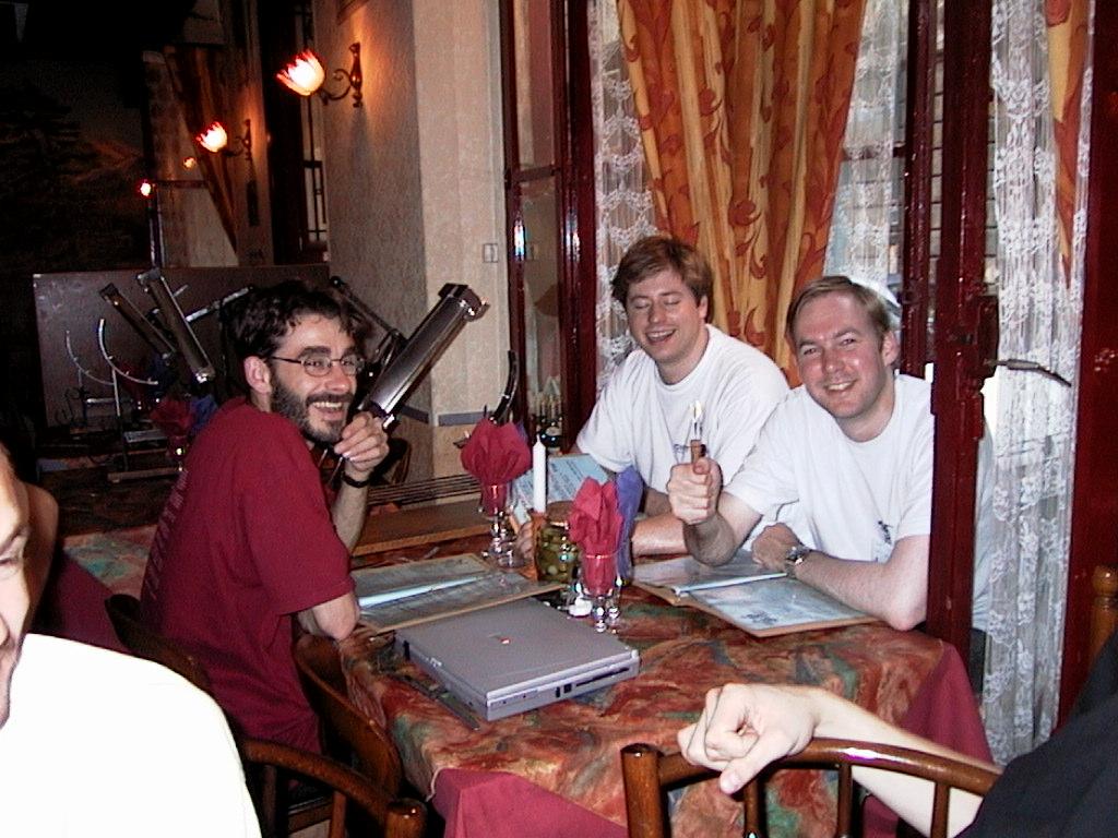 The streeds surrounding the square were filled with dozens of nice looking restaurants serving French food, but our choice for this first evening was a Swiss specialty: the raclette. From the left: Daniel Lutz, Daniel Wagner, Christoph Lameter, me and Anthony Towns. |