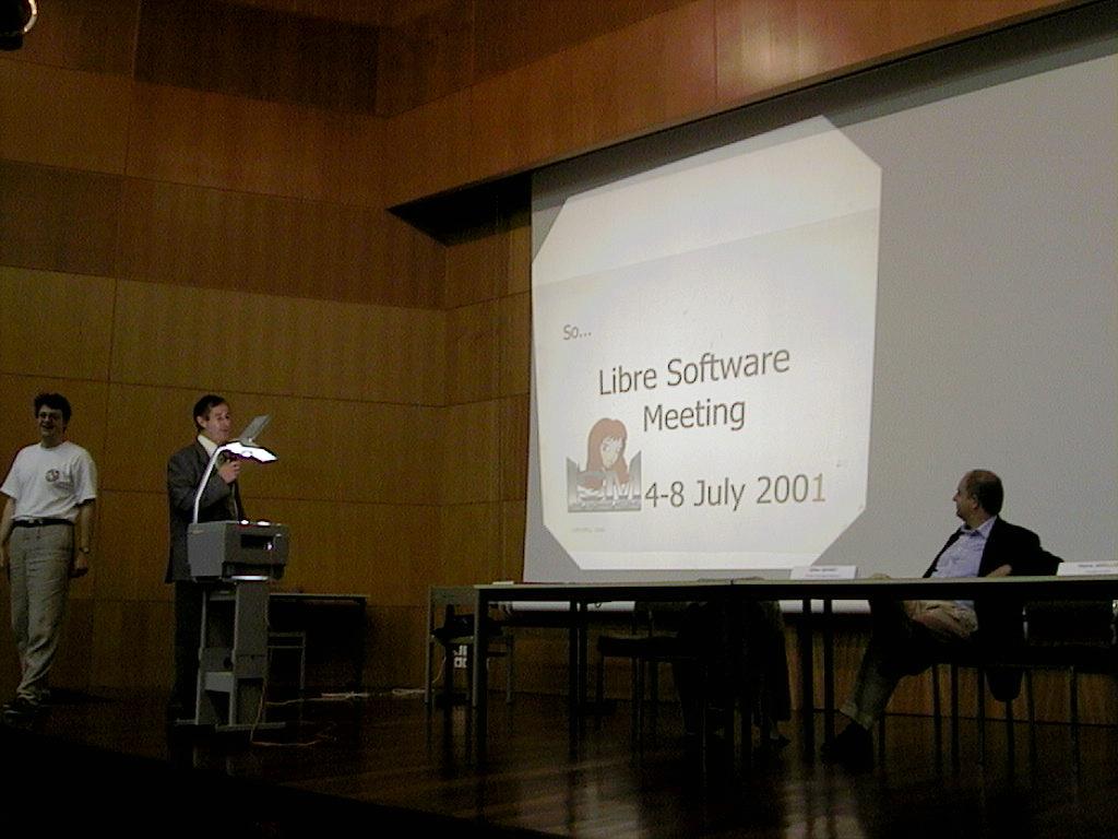 There was still one longer speech reserved for the final day: Richard Stallman's story about the GNU project. As most of the public talks this was also given in French, to many people's surprise he didn't need a translator. The drawback was that a number of foreigners couldn't understand, compromises are always difficult to make. Advertizing could perhaps have been more visible to attract more people, there were still a lot of empty chairs in the main auditorium. |