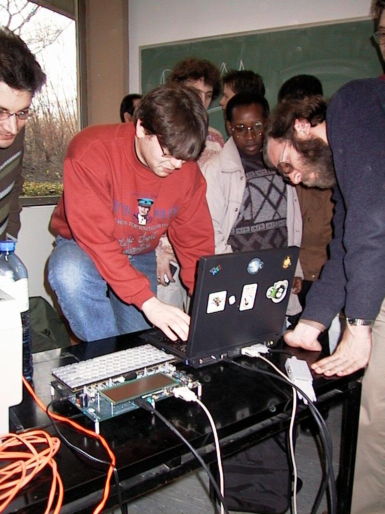 Peter de Schriver demonstrated Linux running on an embedded system test board using an ARM cpu. During his career Peter has been involved in several porting projects. His talk consisted of practical hints how to get started with new systems, mainly compiling the kernel and building the initial userland. Thanks to the framebuffer driver, the cute Linux penguin logo could be seen in the upper right corner of the lcd. |